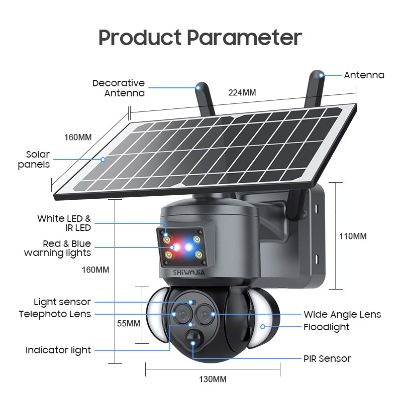 SHIWOJIA 4G SIM / WIFI 12X ZOOM Red/Blue alarm Floodlight Solar Battery PTZ Camera 6MP HD Wireless Security CCTV Including 12000mAh Battery