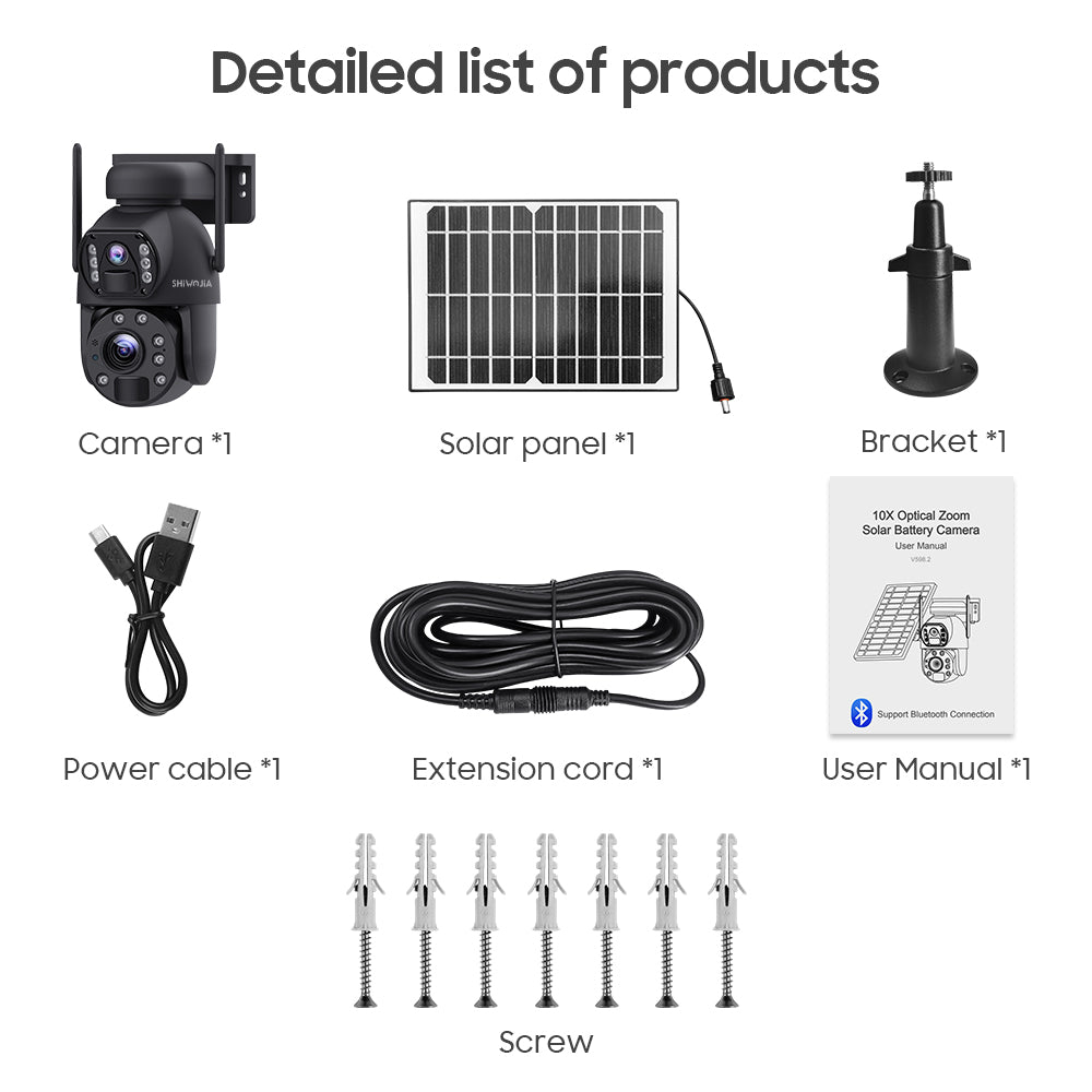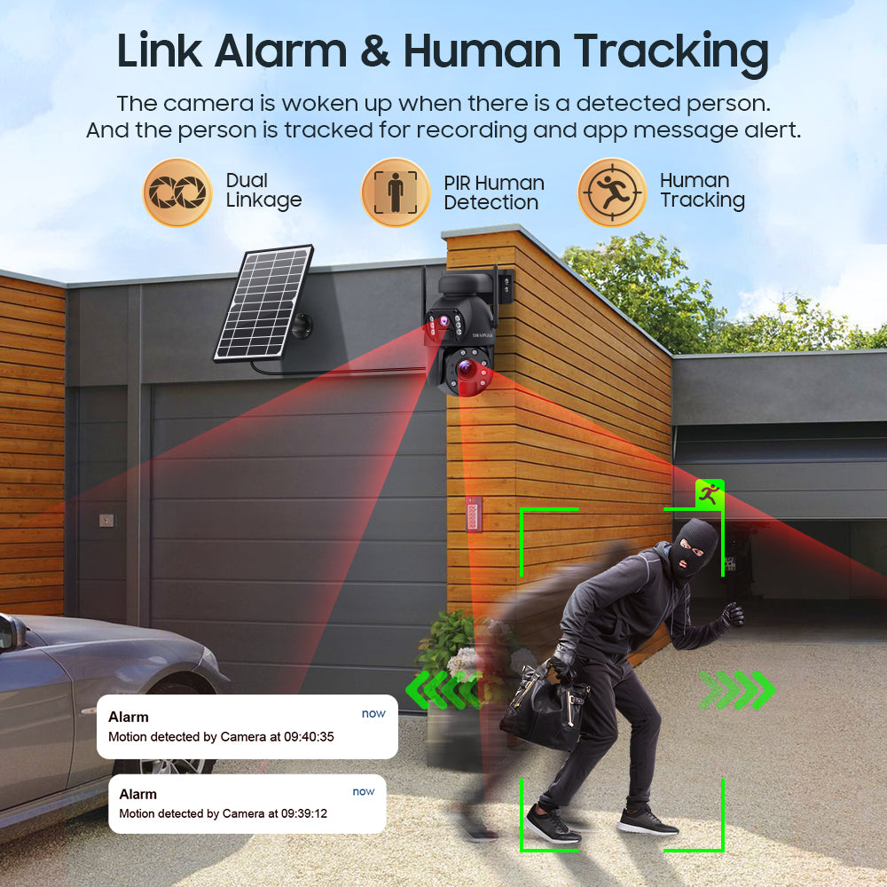 SHIWOJIA 10X زووم بصري 4G SIM / WIFI كاميرا أمان خلوية بعدسة مزدوجة، كاميرا شمسية مزدوجة الرؤية 6 ميجابكسل لاسلكية في الهواء الطلق، إنذار صفارات الإنذار، رؤية ليلية ملونة، شاشة مزدوجة. مدمج في البطارية